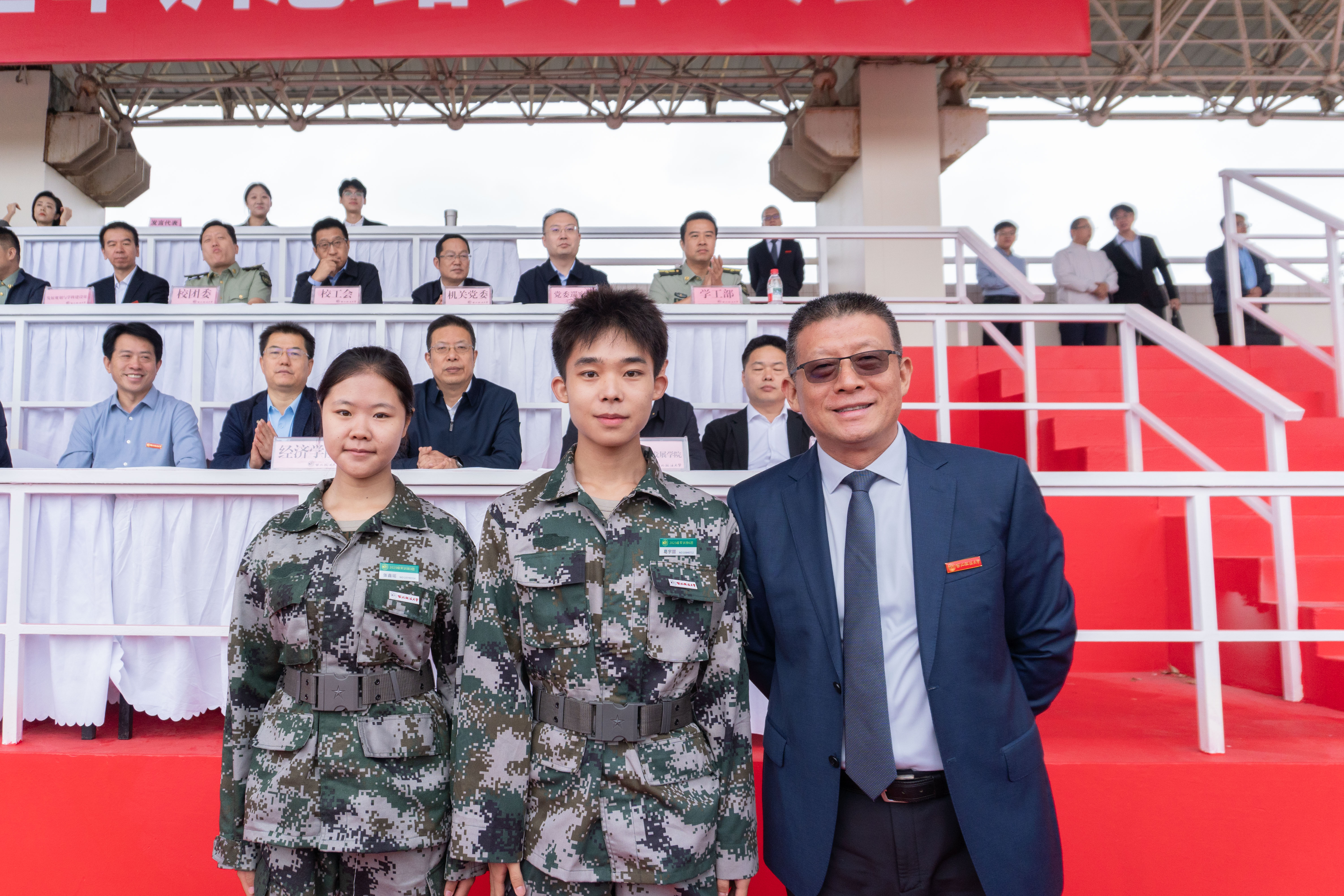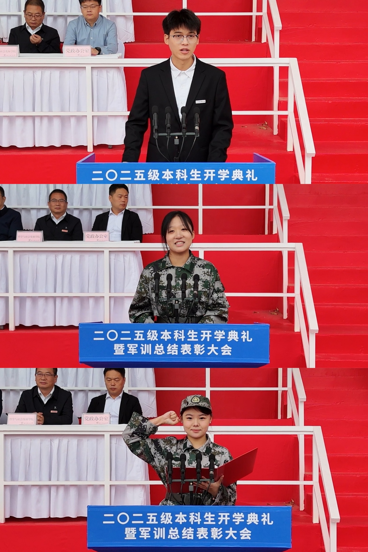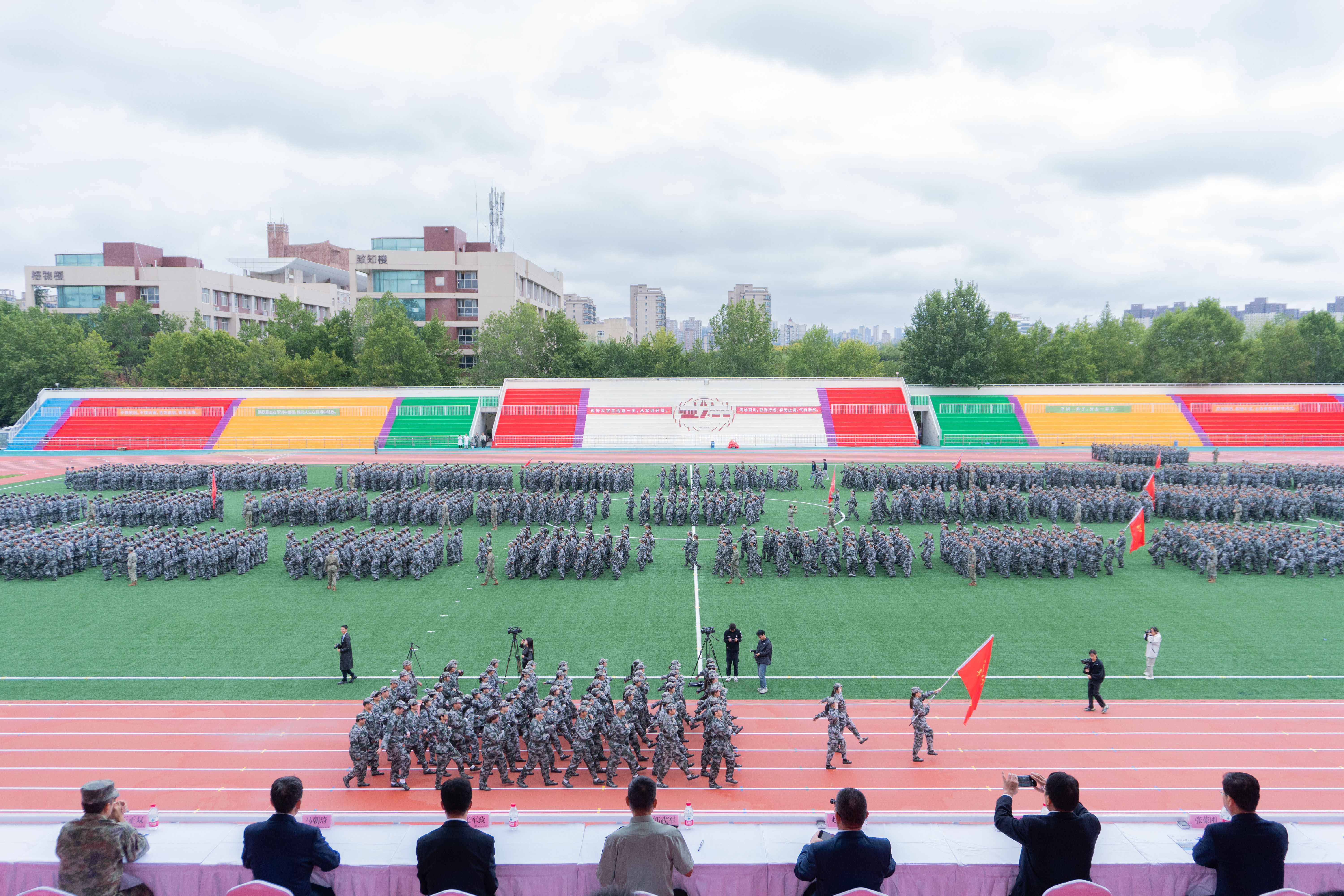 且持梦笔书奇景,日破云涛万里红。 9月19日,我校2025级本科生开学典礼暨军训总结表彰大会在长安校区田径场举行,3555名新生踏入崭新的人生旅程。全体校领导,党委委员,陆军边海防学院中校、军训旅旅长王正双出席大会。校党委副书记郭武军主持开学典礼。副校长、军训旅副政委孙昊亮主持军训总结表彰大会。