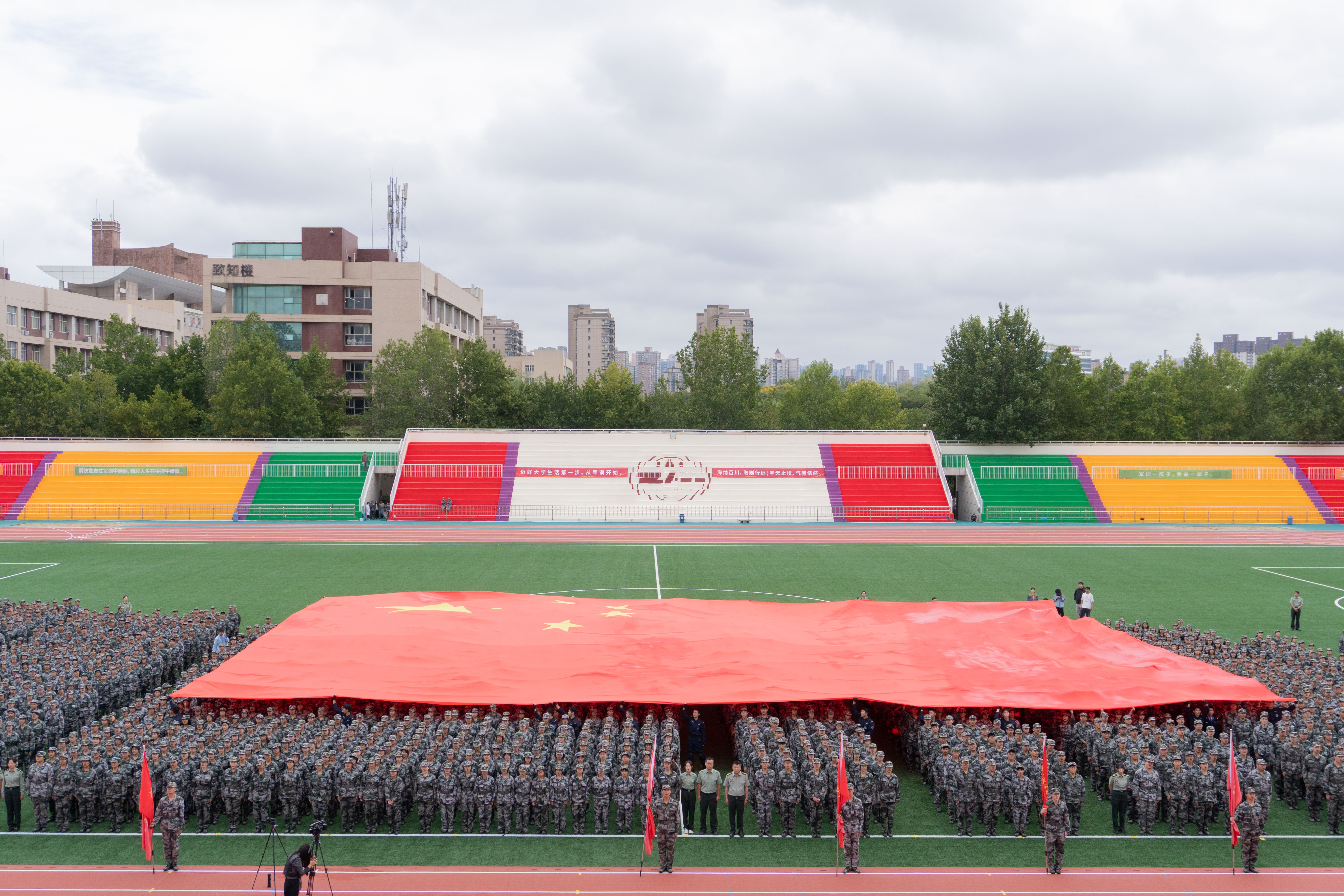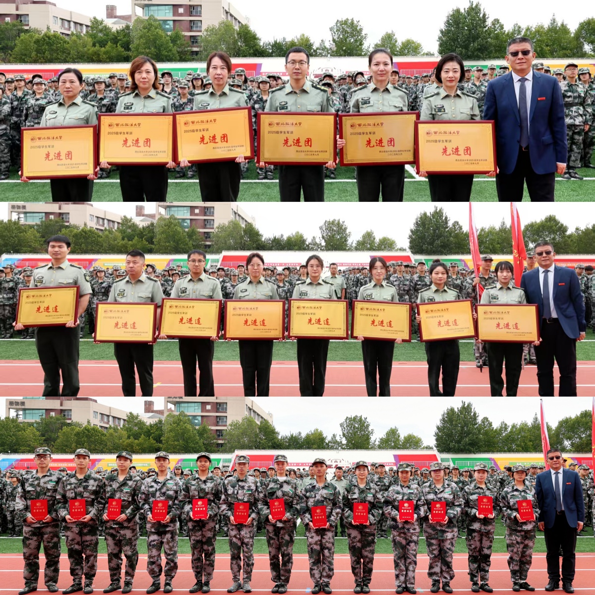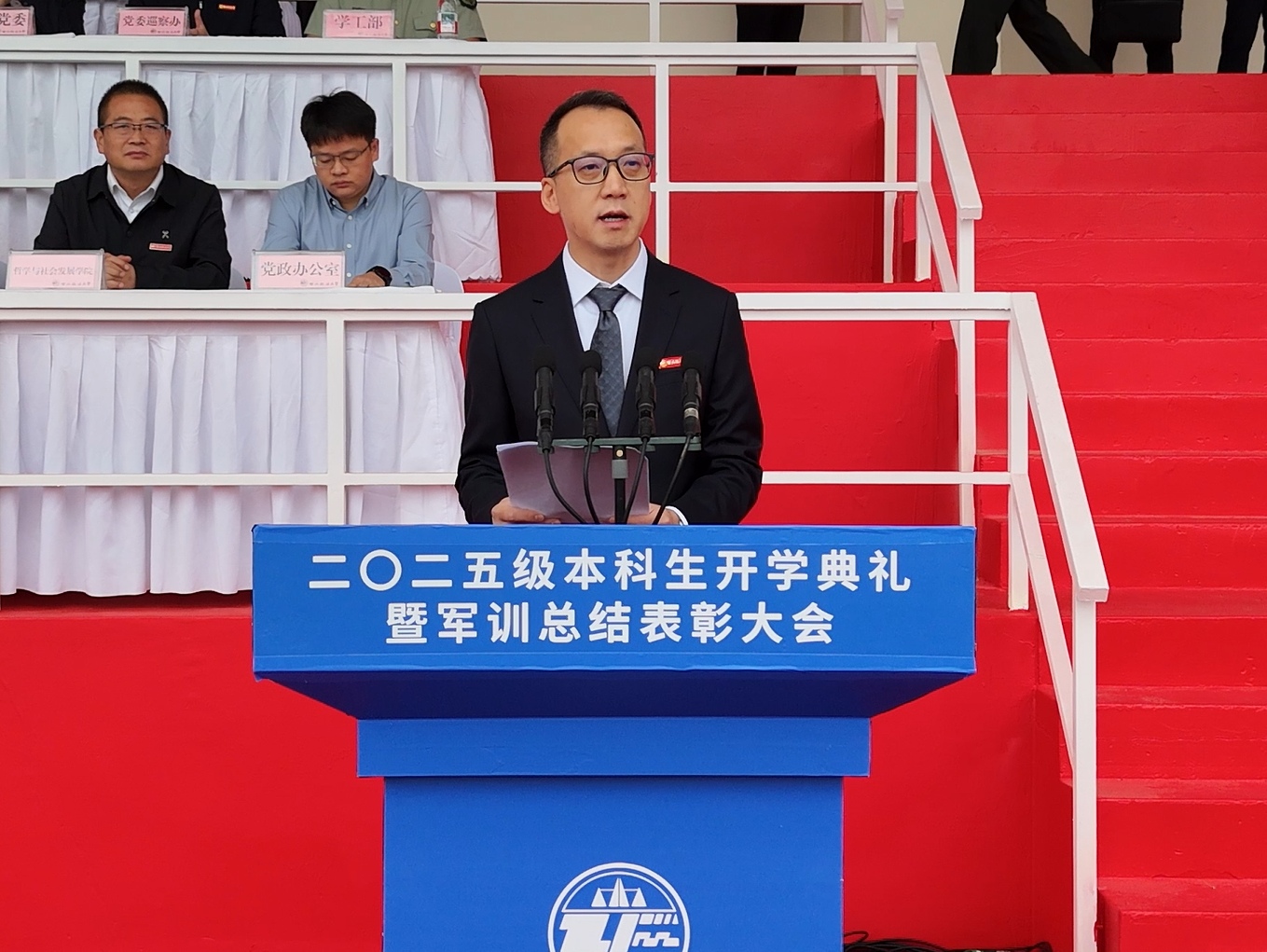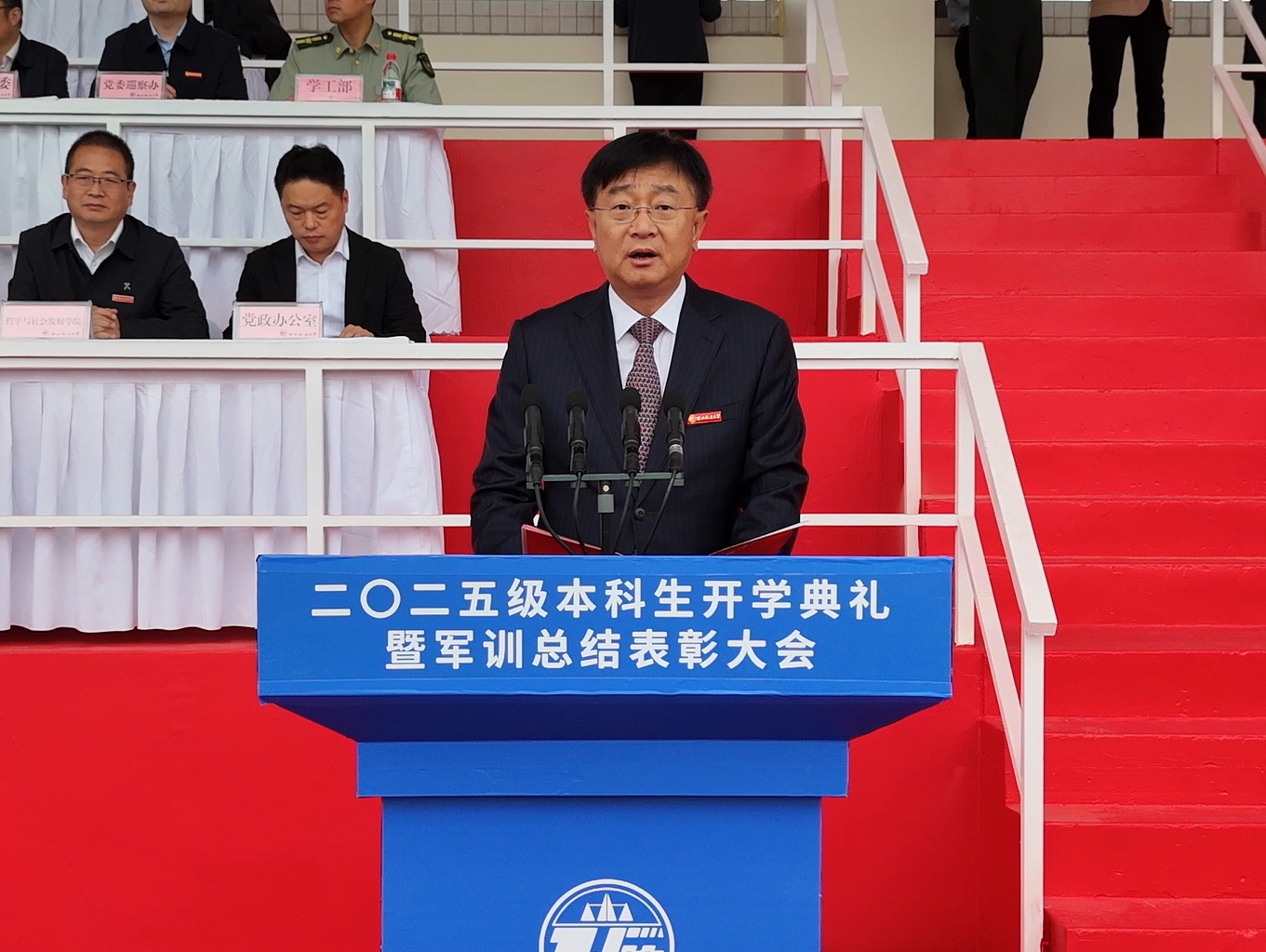 且持梦笔书奇景,日破云涛万里红。 9月19日,我校2025级本科生开学典礼暨军训总结表彰大会在长安校区田径场举行,3555名新生踏入崭新的人生旅程。全体校领导,党委委员,陆军边海防学院中校、军训旅旅长王正双出席大会。校党委副书记郭武军主持开学典礼。副校长、军训旅副政委孙昊亮主持军训总结表彰大会。