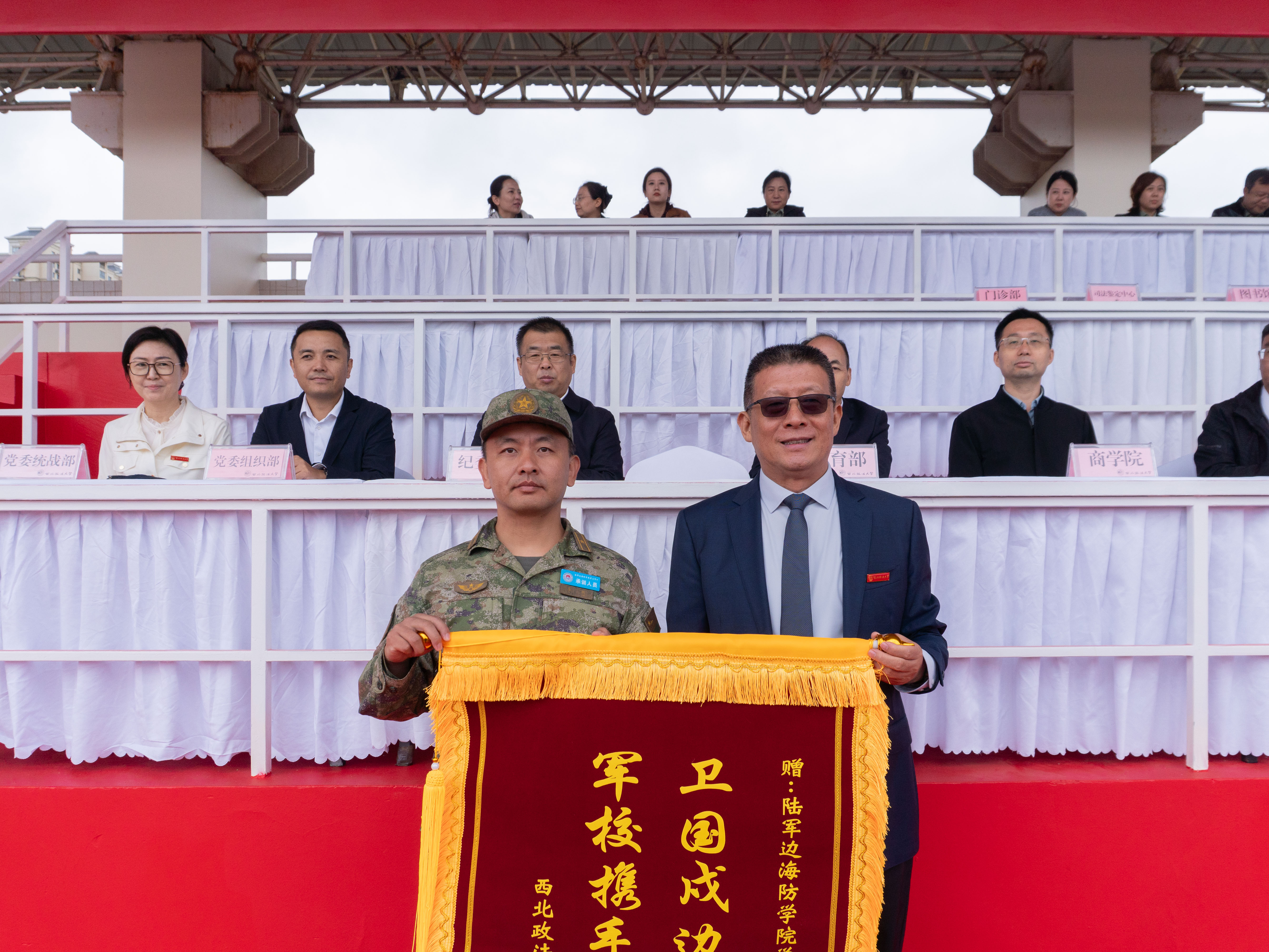 校党委书记赵万东为新生代表佩戴校徽,向中国人民解放军陆军边海防学院赠送锦旗