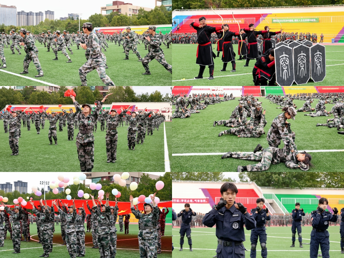 飒爽英姿、气势如虹。在军训旅参谋部副参谋长李昕的现场指挥下,新生们带来了精彩展示。战术表演阵形严整、动作如雷乍起,彰显出军人般的纪律与昂扬斗志;军体拳刚劲有力,招招生风;匕首操凌厉敏捷,气势如虹;团体操通过默契的配合,变幻出寓意深刻的图案与字样,展现团结与协作的力量;射艺表演沉稳而专注,传递出传统与现代交融的尚武精神;韵律操跃动着青春的节奏,洋溢着蓬勃的朝气。整齐的队伍、饱满的热情、精准的动作赢得了阵阵掌声。