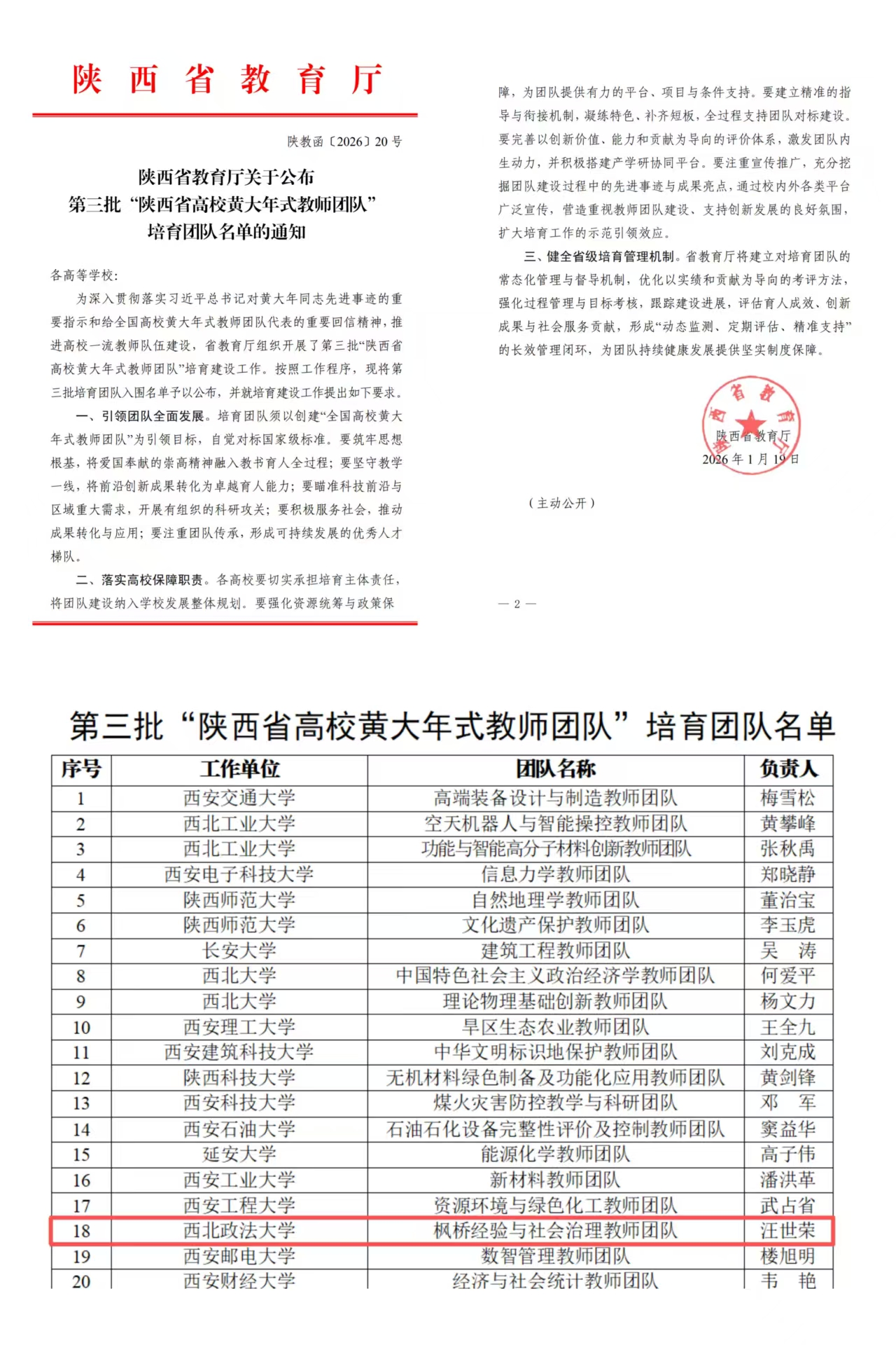 近日,陕西省教育厅下发《关于公布第三批“陕西省高校黄大年式教师团队”培育团队名单的通知》(陕教函〔2026〕20号),我校法治学院 法律硕士教育学院汪世荣教授负责的“枫桥经验与社会治理教师团队”成功入选。这是继2023年国际法学院(国际仲裁学院)王瀚教授负责的“国际法学教师团队”入选第二批“陕西省高校黄大年式教师团队”后,我校师资队伍建设取得的又一重要突破。