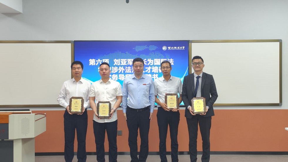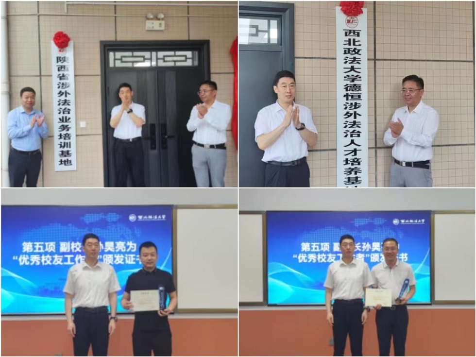 孙昊亮和国际法学院院长刘亚军为陕西省涉外法治业务培训基地揭牌。孙昊亮和闫玉新为beat365游戏平台德恒涉外法治人才培养基地揭牌。孙昊亮为“优秀校友工作者”万商天勤律师事务所主任卫永鹏和陕西秦石律师事务所主任田磊颁发证书。