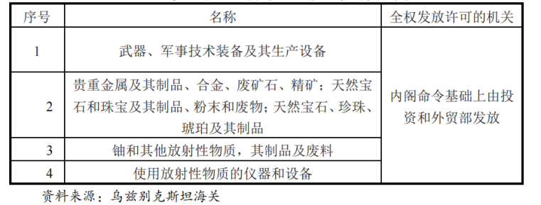 【出口许可制度】根据乌总统令,商品(工程及服务)出口许可制自1997年11月1日起废止,特殊商品(军备及军事技术、生产武器装备的专门配套制品;贵重金属、合金及其制品、矿石、精矿、贵重金属废料及副产品、天然宝石及其制品、天然宝石副产品及粉末、珍珠及其制品、琥珀及其制品;铀及其他放射性物质、铀及其他放射性物质制品、放射性物质副产品;放射性物质使用仪器及设备)除外。上述商品的出口合同须先在乌兹别克斯坦投资和外贸部登记。乌内阁1998年3月31日第137号决议列出了特殊商品(工程及服务)清单,所列商品须具有乌主管机关发放的许可才可实施进出口。
