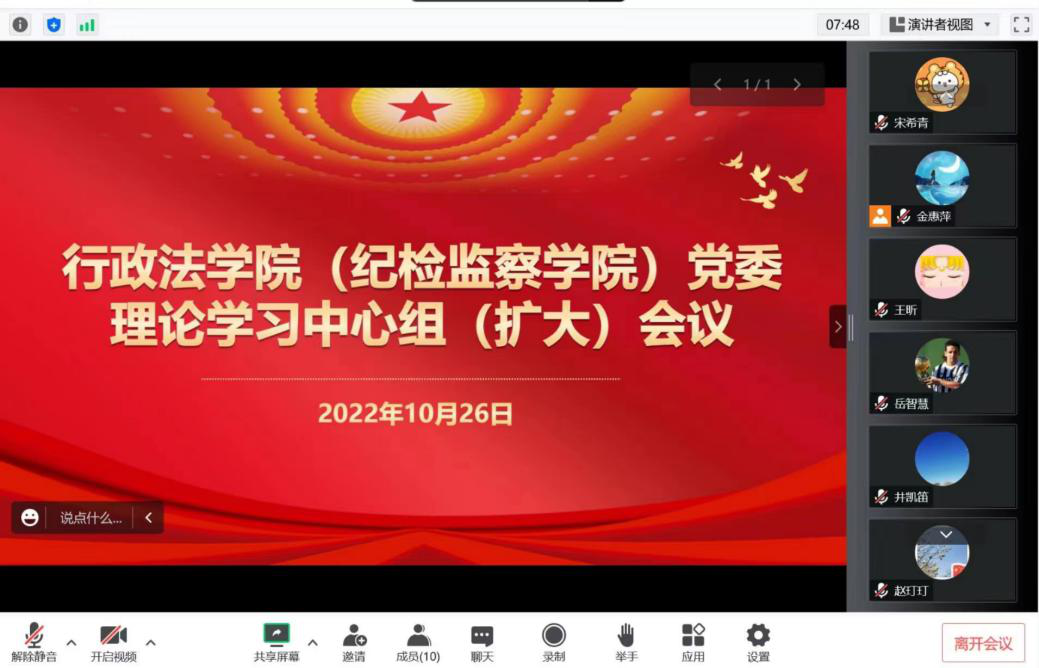 10月26日下午,行政法学院(纪检监察学院)在线上召开党委理论学习中心组(扩大)会议,专题学习中国共产党第二十次全国代表大会精神。学院班子成员、党支部书记、行政干部及全体辅导员参加学习。学院党委书记赵玎玎主持会议。