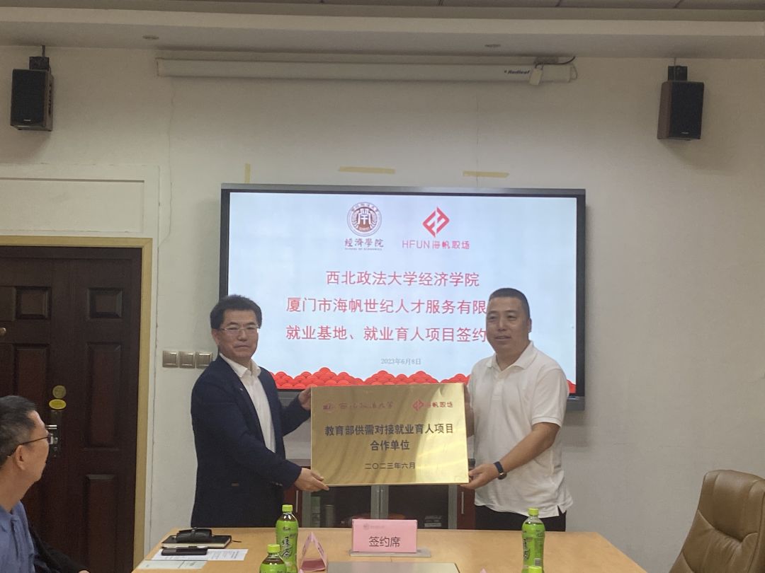 6月8日上午,我校与厦门市海帆世纪人才服务有限公司在长安校区天平楼A座关天会议室举行就业基地、就业育人项目签约仪式。厦门市海帆世纪人才服务有限公司总经理兼教育部全国普通高校毕业生就业创业指导委员会委员夏希东、中侨国际文化有限公司总经理巨大理、凤凰网陕西频道政企事业部总监石世增、陕西绿洲保险代理有限公司培训部总经理潘黎等参加仪式,招生就业处、经济学院相关负责同志及经济学院师生代表参加仪式。签约仪式由经济学院院长王胜利主持。